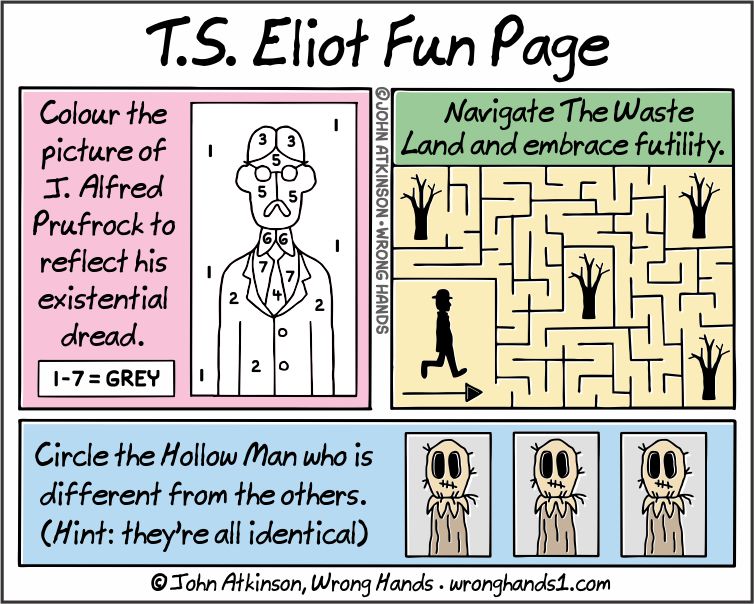 Posted in Cartoon | Tagged Games, Humour, J Alfred Prufrock, John Atkinson, Literature, Poetry, Puzzles, Reading, The Hollow Men, The Waste Land, TS Eliot, Webcomic, Wrong Hands | 2 Comments »