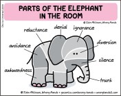 […] an old cartoon by John Atkinson called “Parts of the Elephant in the Room.” It labels them as: avoidance, denial, silence, reluctance, diversion, and so […]