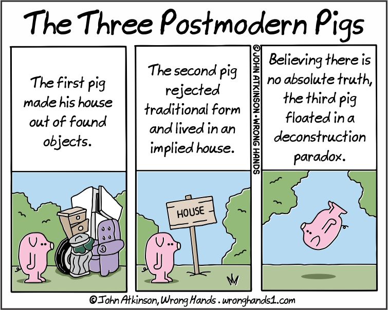 Posted in Cartoon | Tagged Art, Fables, Fairy Tale, Humour, John Atkinson, Postmodern, Postmodernism, The Three Little Pigs, Webcomic, Wrong Hands | 3 Comments