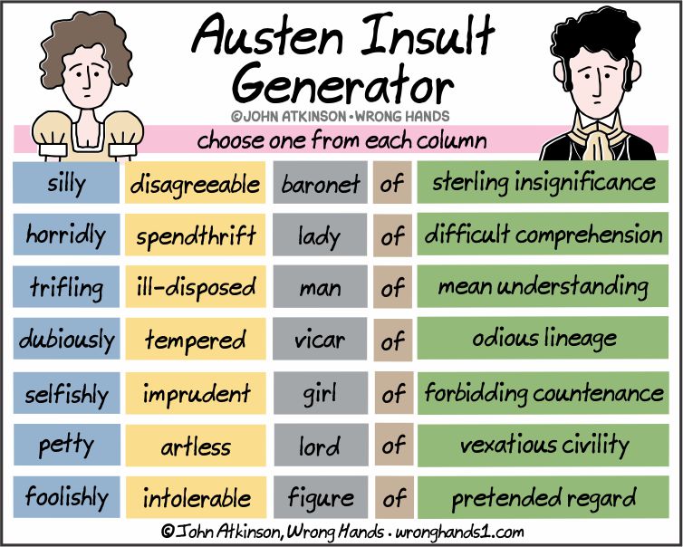 Posted in Cartoon | Tagged Books, Funny, Generator, Humour, Insult, Jane Austen, John Atkinson, Literature, Reading, Webcomic, Wrong Hands | 2 Comments